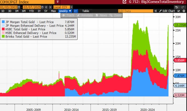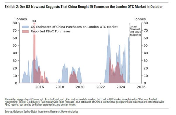 Gold flowing across geographies is nothing new, and it's not only New York's Comex vaults that have seen massive inflows in recent months. In fact, global flows of physical gold out of London are largely directed eastward, with most commercial gold eventually ending up in China via Switzerland. According to customs data, Switzerland imports about 1,000 tonnes of London gold annually, where it is refined in various Swiss mints and redirected to retail markets, primarily in China and, to a lesser extent, India. Indeed, China’s undisclosed purchases in the London OTC market reached an all-time high in late 2024 and continue to this day.
