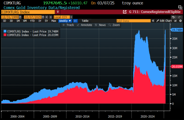 Comex Registered Gold Inventory (blue histogram); Comex Eligible Gold Inventory (red histogram).