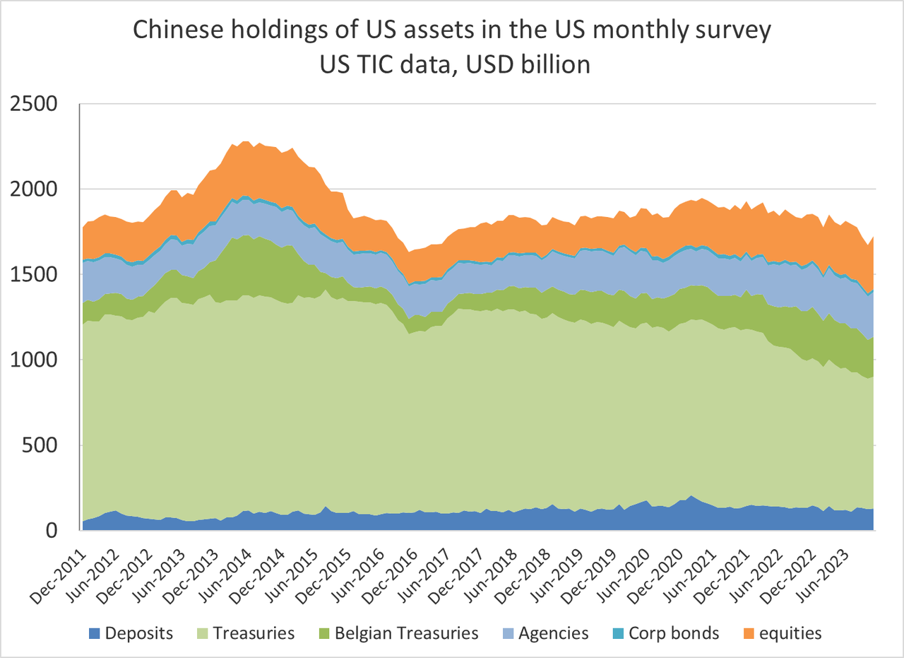 In any case, it's hard to make sense of this disconnect - after all, if a foreign nation is running a large trade surplus with the US, but isn't recycling that surplus back into Treasuries, where are those dollars going? Sticking with the example of China, Brad Setser has showed that total Chinese dollar reserves are virtually unchanged, but its composition includes less Treasuries. Instead, those dollars are recycled into other USD assets, like mortgage-backed securities (Agency MBS) and equities:
