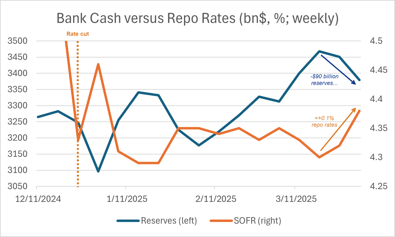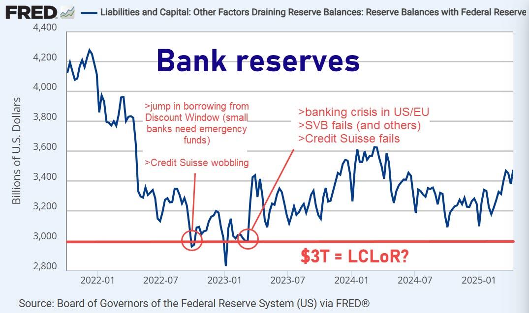 If we just assume John Comiskey is correct and that April tax revenue will be about $700 billion, the drawdown in bank reserves would total about $650 billion over two weeks. Not only will this completely bind dealers' ability to intermediate in collateral markets like Treasury repo (basis trades), but it will also bring us right below $3 trillion - the minimum level of bank cash before stresses appear - a red line which the Fed is clearly watching.