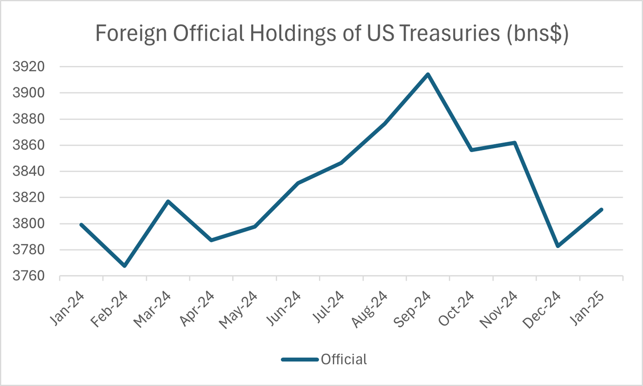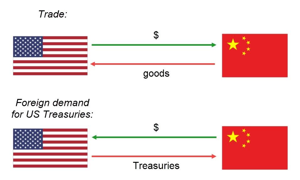 As I showed last August, the gross uptick in foreign US Treasury demand over the last year came from the non-official sector (which means any financial entity that's not a government or central bank) on the margin. Many of which were probably foreign hedge funds, since foreign pensions, banks and life insurers would FX-hedge their Treasuries. Those foreign non-official bond purchases were basically speculative, not funded with the dollars recycled from trade surplus.
