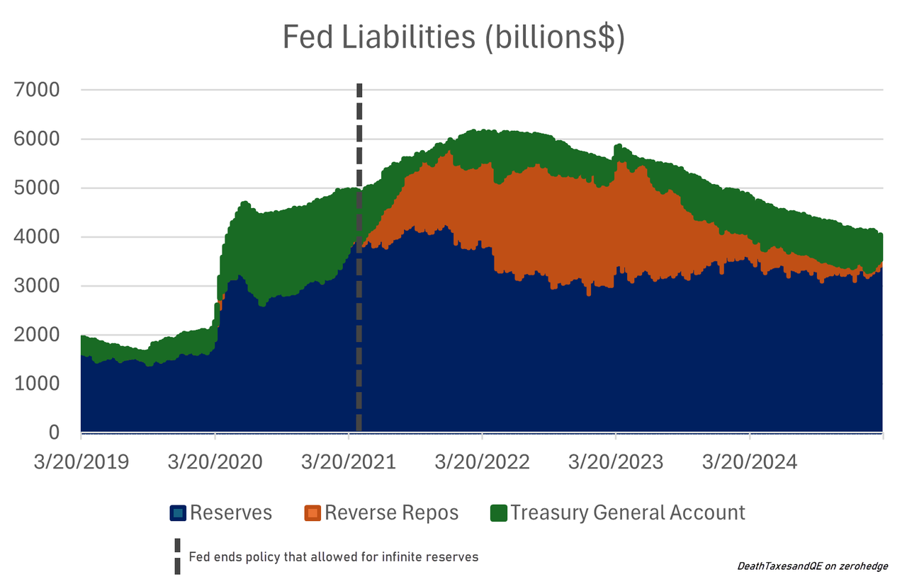 Exempting reserves from the SLR, however, is another huge step - it's the only reason why QE started to bind in 2021. Banks were forced to take all those excess reserves they received from QE trades and shift them into reverse repos with the Fed to comply with regulations. With the exemption, having "too many" reserves becomes an oxymoron.