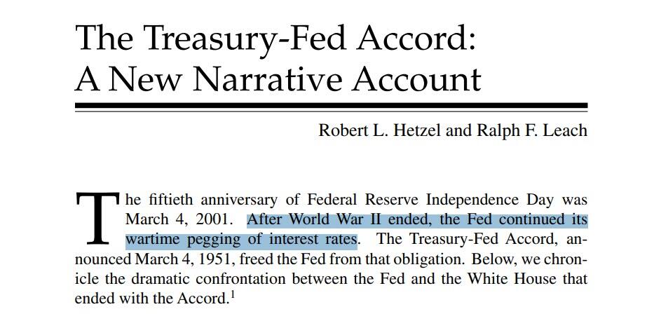 By the time the US entered into World War II, interest rates were set in consultation with the Treasury, who insisted that the Fed cap rates low. The Fed obliged, and operated a framework where short-term rates were set at 0.375% and longer-term yields were capped at 2.5%. While this began under the emergency pretense of global war, it continued for seven years after the war.