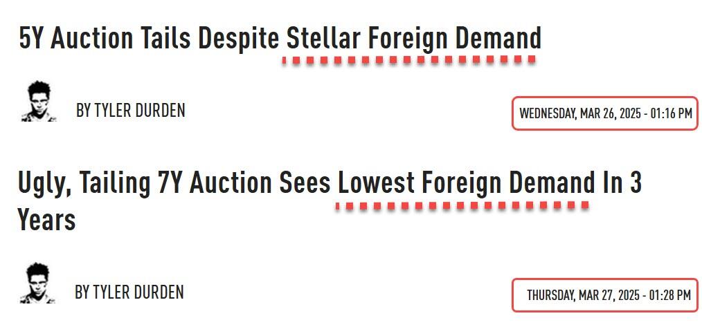 You would not realize that this is what's going on just by looking at the results for Treasury auctions: one day can have "stellar" foreign demand, and the next day you might see the weakest in years. I mean, literally, the next day...: