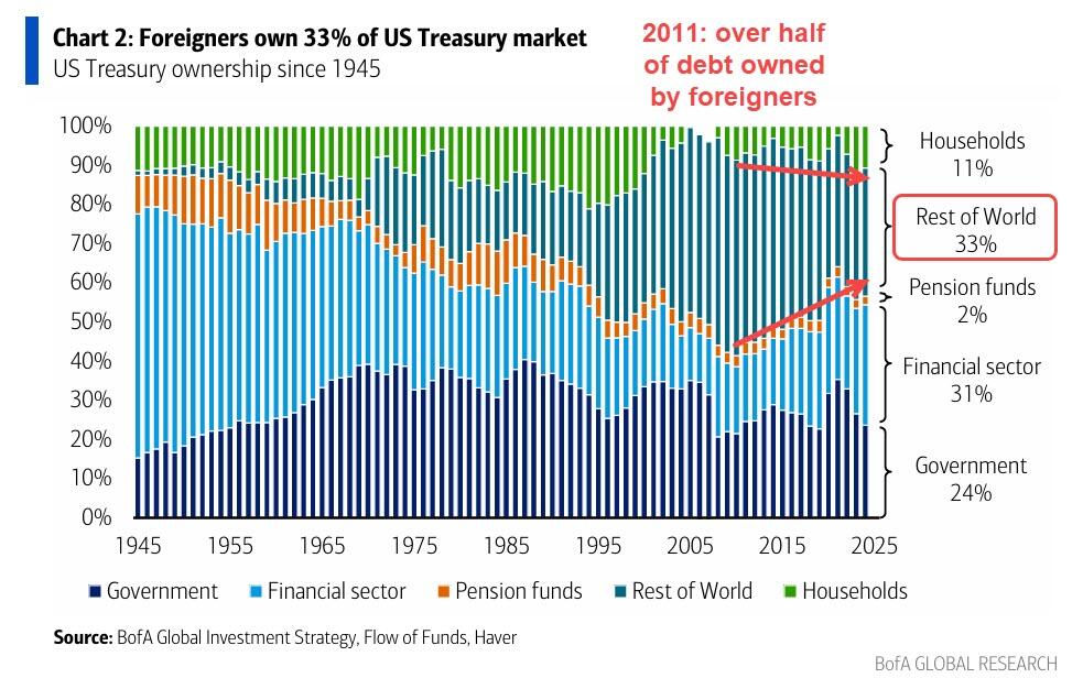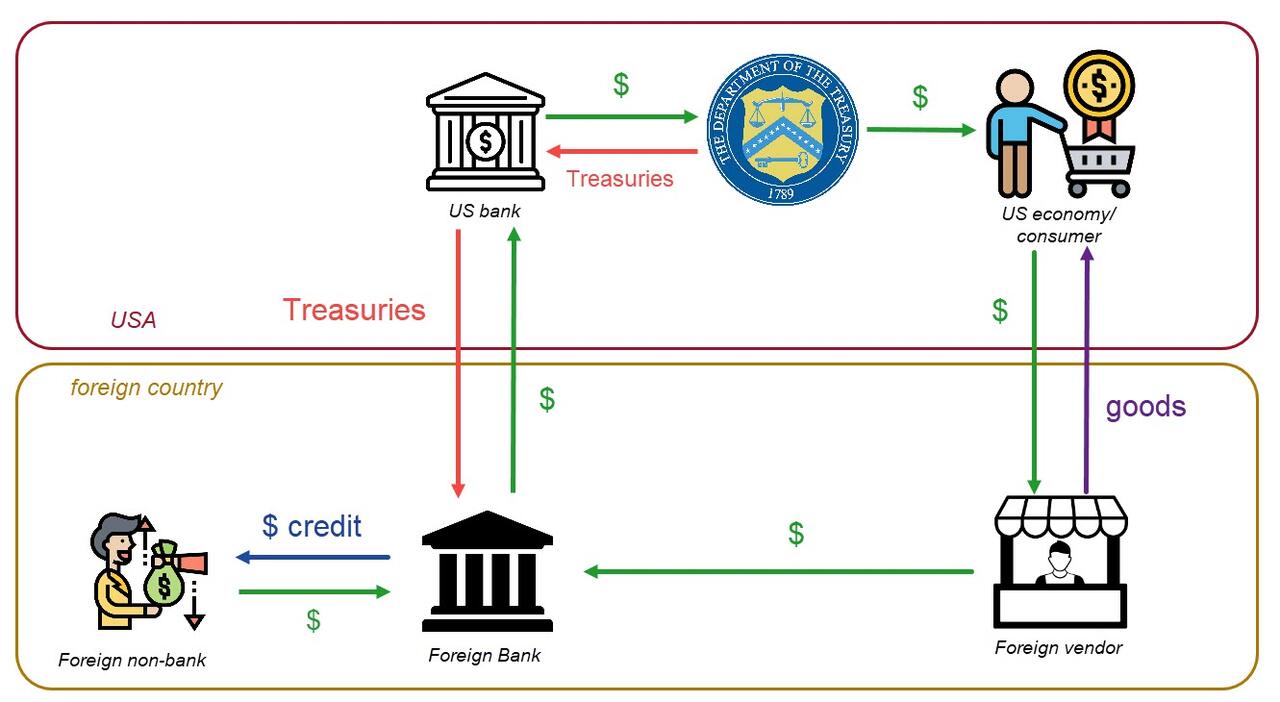For decades, we had an undisputed, unipolar world order - a global system where foreign nations running a trade surplus would trade goods for dollars and recycle those earned dollars into Treasuries, giving them a parking spot in the US financial system that backstopped their banks. Treasuries could easily be monetized (sold) for cash or pledged as collateral for dollar loans in the repo market. In some ways, foreign banking systems came to rely on this setup even more than the US banking system did.
