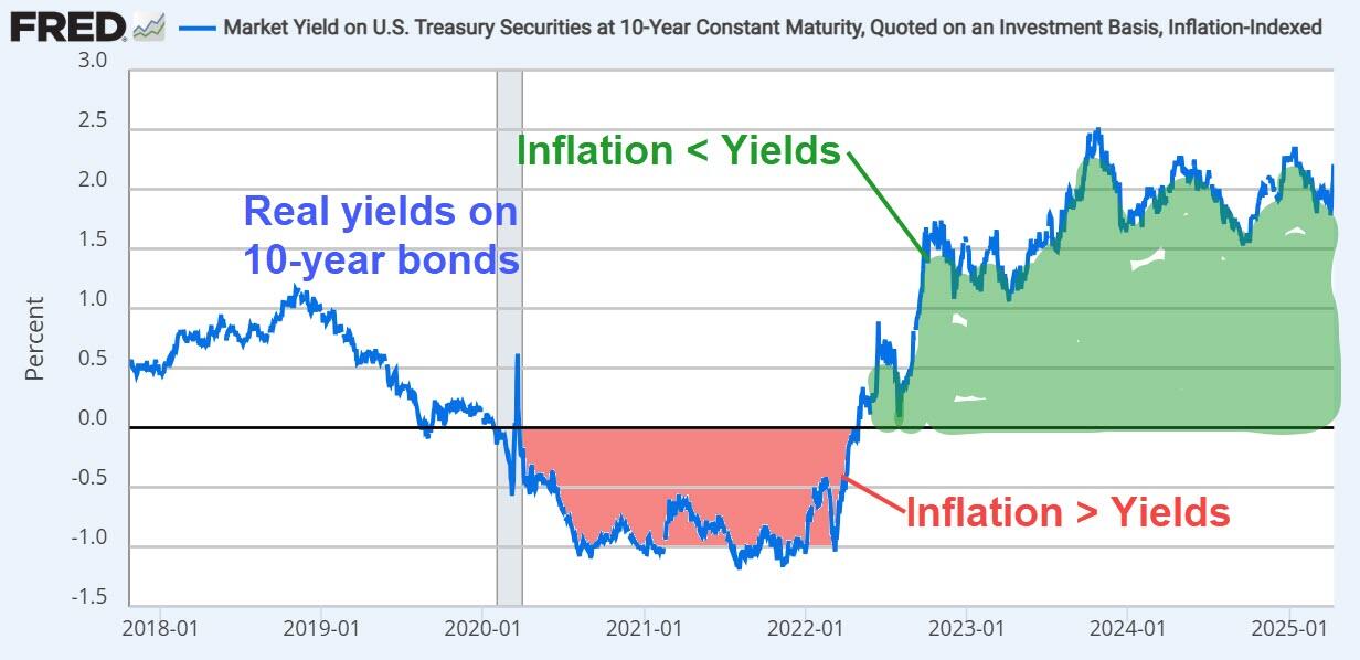 Pozsar's adage was speaking directly to bond holders, warning of a coming negative real interest rates regime, a.k.a. financial repression where Treasuries yield less than inflation. Again, in the Pax Americana paradigm, this isn't *supposed* to happen: interest rates are *supposed* to account for inflation. You don't buy a bond for a 2% yield if inflation is thrice that, because you'll lose the difference: you'd be financially repressed. The bond market is *supposed* to price inflation with positive real yields, nominal yields above inflation, unless the Fed is buying in the midst of a depression.