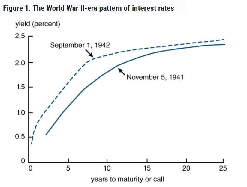 A concerted shift to War Finance would see fiscal policy (Treasury spending) and monetary policy (what the Fed does with interest rates and its balance sheet) fuse, since one channel alone would not suffice. One of the most classic examples of this link is a Yield Curve Control (YCC) policy. Few people know the history, but it won't be America's first foray into YCC.