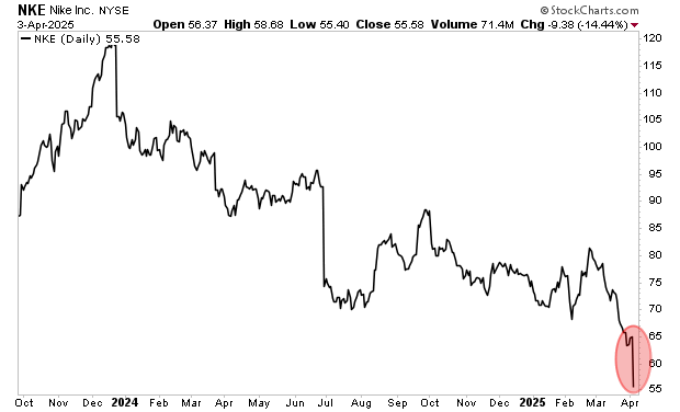 Nike (NKE) which relies heavily on Vietnam (a nation Trump slapped with a 46% tariff) collapsed 14%.