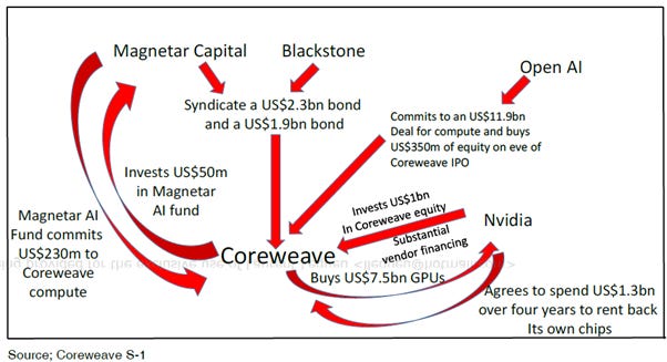 The prevalence of round-tripping in the AI ecosystem is so pervasive that one might wonder if any major transactions in this market don’t involve some form of double-dealing. This raises a significant red flag for the entire industry. The chart below represents the best attempt to illustrate the round-tripping Coreweave is involved in, based on the company's S-1 filing. Full disclosure: this is likely only a partial picture, and there may be errors in the analysis. Some assumptions about the identity of firms whose names have not been fully disclosed have been done, as companies rarely disclose their counterparties unless absolutely compelled to do so.