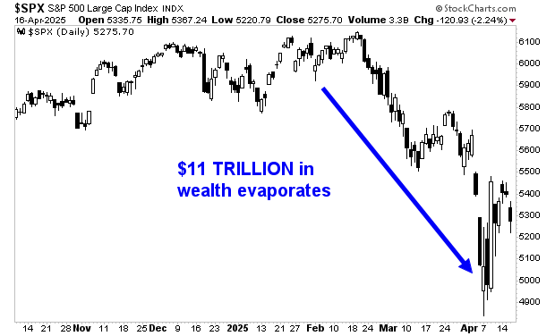 The stock market just experienced one of its worst collapses in history. It was literally the 5th fastest 10% decline in the last 75 years. All told some $11 TRILLION in wealth has been erased. And it’s not as if the markets have stopped breaking down. The chart of the S&P 500 is UGLY.