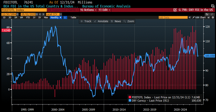 Looking at the facts rather than listening to the propaganda spread by desperate news outlets with no track record in financial investment, if the real ultimate goal of implementing retaliatory tariffs is to promote Foreign Direct Investment (FDI)—as attracting foreign investors to build plants and manufacture goods in the US is seen as key to reindustrialization and "making America great again"—then a look at the past 30 years of data shows a close correlation between FDI in the US and the evolution of the DXY (US Dollar Index). As common sense should dictate, when foreign investment increases, the DXY tends to strengthen, suggesting that FDI flows have a positive impact on the value of the US dollar. This dynamic reinforces the idea that fostering FDI could be a crucial driver of both economic growth and dollar strength.