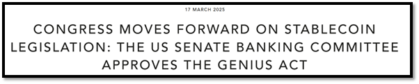 The GENIUS Act, which clears up U.S. regulations on stablecoins, passed the Senate Banking Committee in March and is on track for a smooth ride through Congress and a presidential sign-off by summer. This legislation would give the stablecoin industry an official seal of approval, making digital assets that mimic the stability of the USD even more legitimate—because who doesn’t want more stable, government-backed digital money?