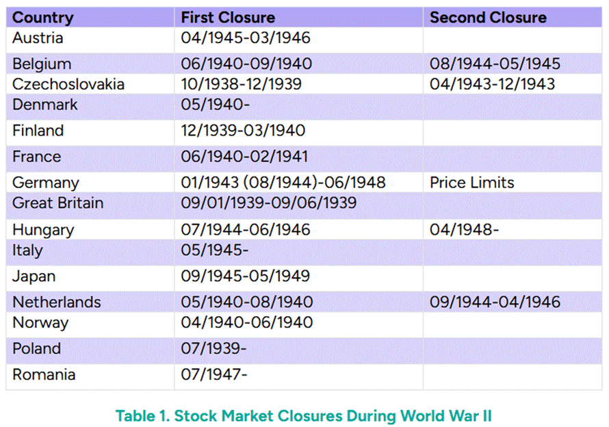 In 1914, markets, like today were all open and globally integrated, but the war freaked everyone out, causing stock exchanges to shut down for months. Fast forward to 1939, and—surprise! —markets were more domestic, capital controls were in play, and gold wasn’t the lifeblood. The New York Stock Exchange? Stayed open. London? Closed for just a week. Meanwhile, German stocks soared as their blitzkrieg steamrolled across Europe, and Vienna’s exchange simply became part of the German market. The Warsaw Stock Exchange? Closed after Poland fell. The financial landscape had shifted, and stock markets were no longer as fragile.
