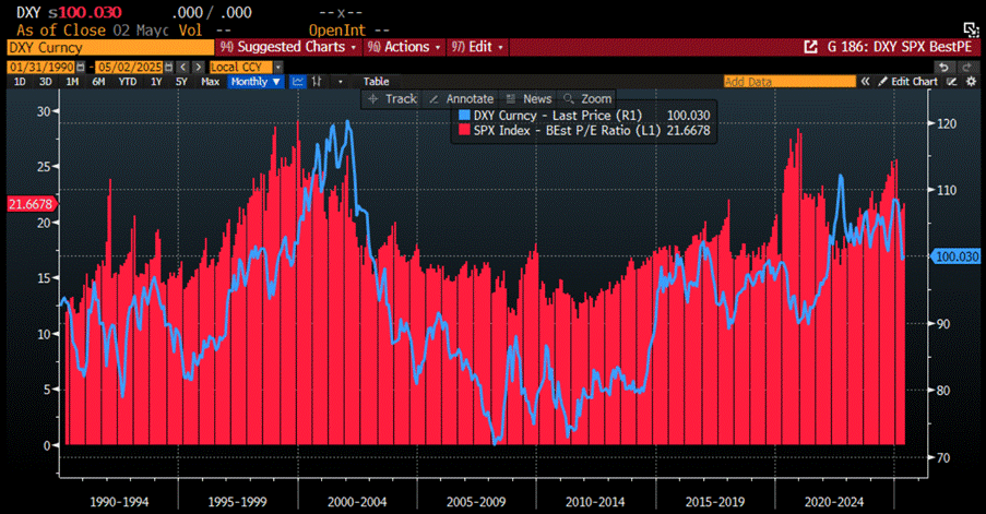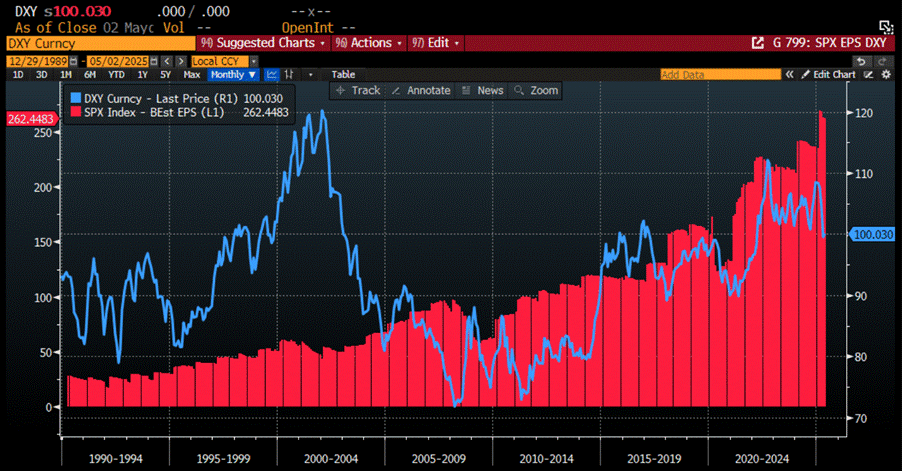 For equity investors, the recent dip in the USD index should raise some eyebrows. Historically, a weak DXY tends to signal an economic bust in the US, which—surprise, surprise—also leads to lower EPS for the S&P 500 over the past 35 years.