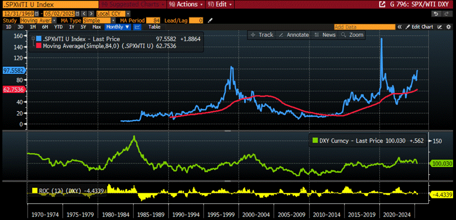 Upper Panel: S&P 500 to Oil Ratio (blue line); 7-Year Moving Average of S&P 500 to Oil Ratio (red line); Middle Panel: USD Index (DXY Index); Lower Panel: USD Index 12-Month Rate of Return (Yellow histogram).