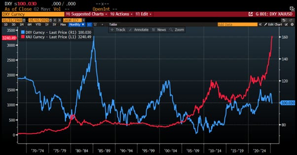 The IMF found 46 “active diversifiers” among central banks — basically anyone with at least 5% of their reserves in "nontraditional" currencies. Why? Simple: better liquidity and desperate yield-chasing during the not so distant 0%-interest era. Meanwhile, the USD has been on a rollercoaster and is still miles below its 1985 glory days. Fun fact: today’s dollar index level is right where it was in December 1977, while the price of gold expressed in the same USD is eight times higher than it was that year.