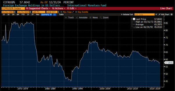 According to the IMF’s latest COFER data (Q3 2024), the USD’s share dropped to 57.4% — the lowest since 1994. Back in Q1 2015, it was 66%. At this rate, the dollar will slip below 50% by 2034 — not that anyone at the Fed or the Treasury seems too worried as they keep tossing gasoline on the fire.