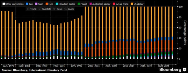 Anyone who's been awake since 2020 — and especially since the "who-could-have-seen-it-coming" weaponization of USD assets after February 2022 — knows that de-dollarization didn’t just start; it hit the gas pedal. In a nutshell, King Dollar is still sitting on the throne, but it's looking a little shaky: its share of global reserves has been zigzagging lower for years as central banks quietly swapped dollars for other currencies... and, of course, for that barbarous relic, gold.