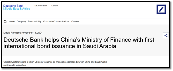 Meanwhile, the Global South is growing impatient with the geopolitical risks tied to accessing USD liquidity, especially at a time when USD is still needed to service the massive debt accumulated during the Covid lockdown era and less dollars are generated since the global south is increasingly trading in respective local currencies as a pillar of its mercantilist development. On November 13, 2024, China made its first-ever sovereign USD bond debut in Saudi Arabia—raising a cool $2 billion, with demand hitting $39.73 billion. This wasn’t just a financial move; it was a clear shot at strengthening ties with Saudi Arabia and aligning with Vision 2030. It’s a strategic play, not just a bond. This issuance wasn’t just about money—it’s a diplomatic jab, diversifying the global financial system. The funds raised could fuel China's Belt and Road Initiative, reducing reliance on USD liquidity that’s beyond the reach of the FED and, ultimately, the US government.