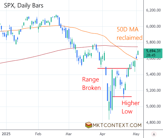 Then came Liberation Day tariffs, which drove the market to price in a proper recession. SPX dropped another 14% from that date. But since then, the news has been stalling, not getting worse. Bear markets need worsening bad news to continue selling off. Instead, we got resilient econ data points despite ample fear and negative sentiment. Tariff talk cooled off as countries came to the negotiating table and Trump announced delays and exceptions. Even China looks ready to negotiate now.