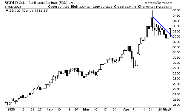 The pullback in gold appears to be ending with the precious metal once again catching a bid. This is extremely bullish. Remember, gold ripped from $2,950 to over $3,500 per ounce in the first half of April alone. The fact the precious metal has only corrected down to $3,200 per ounce before catching another bid indicates there is incredible demand from investors.