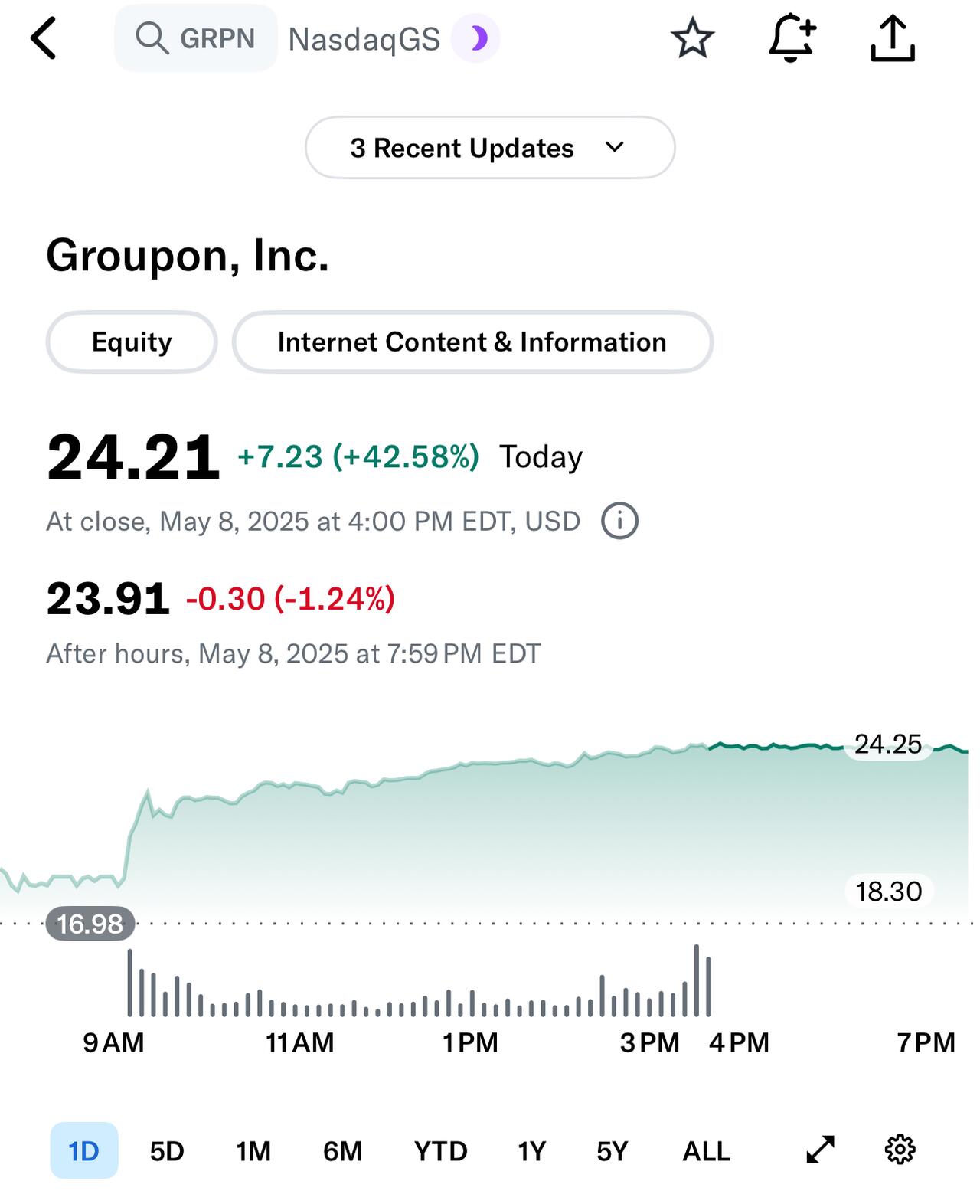 Potentially ride post-event continuation, if the name trends as it did with GRPN and QBTS.
