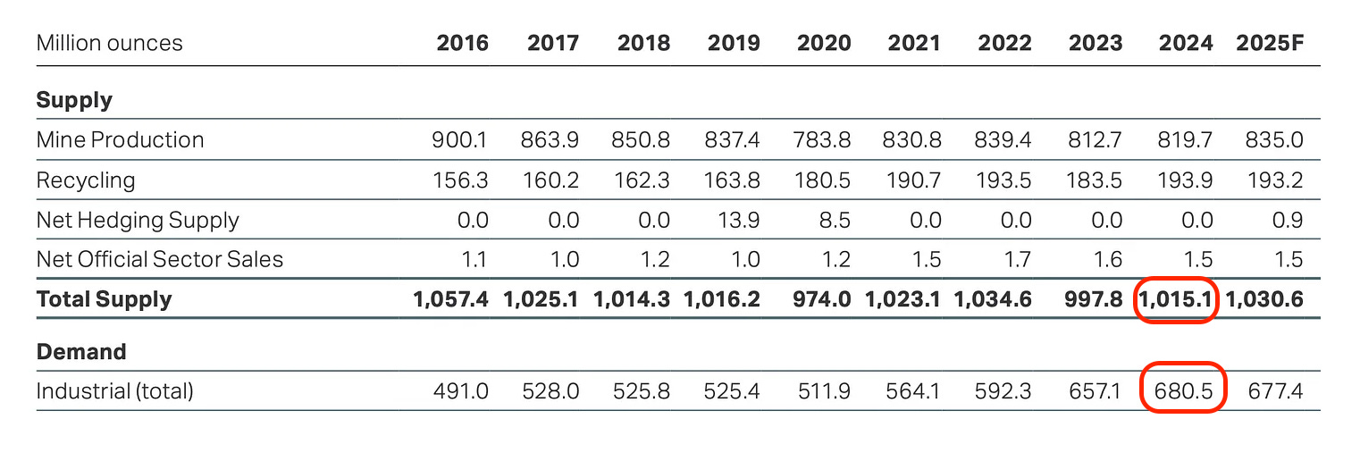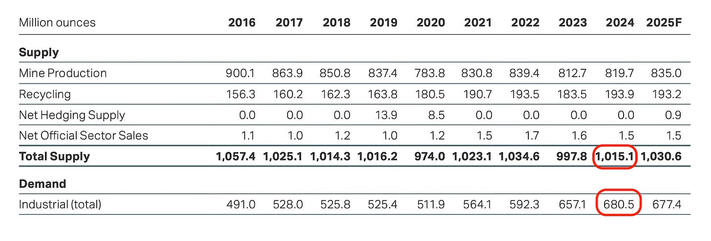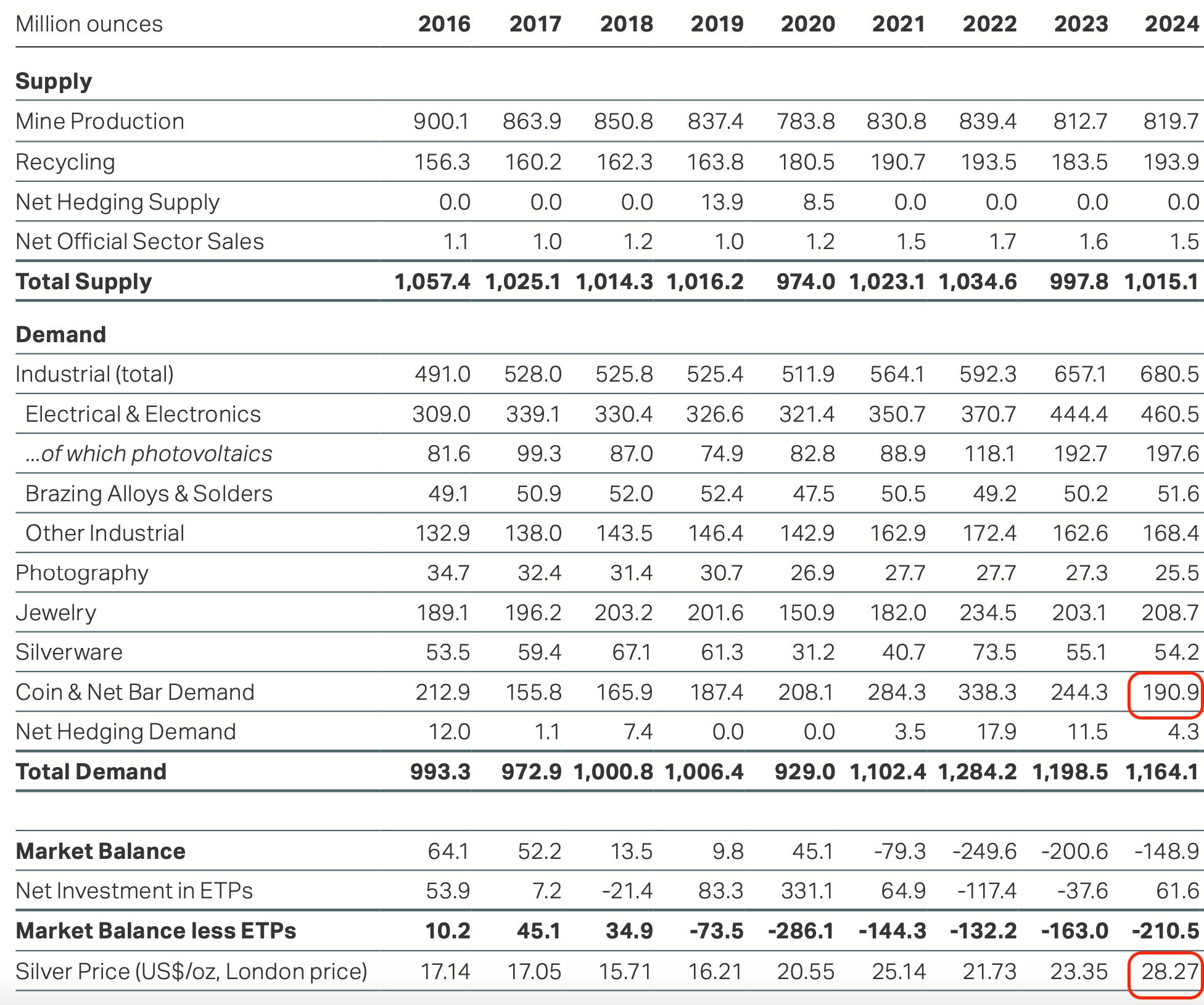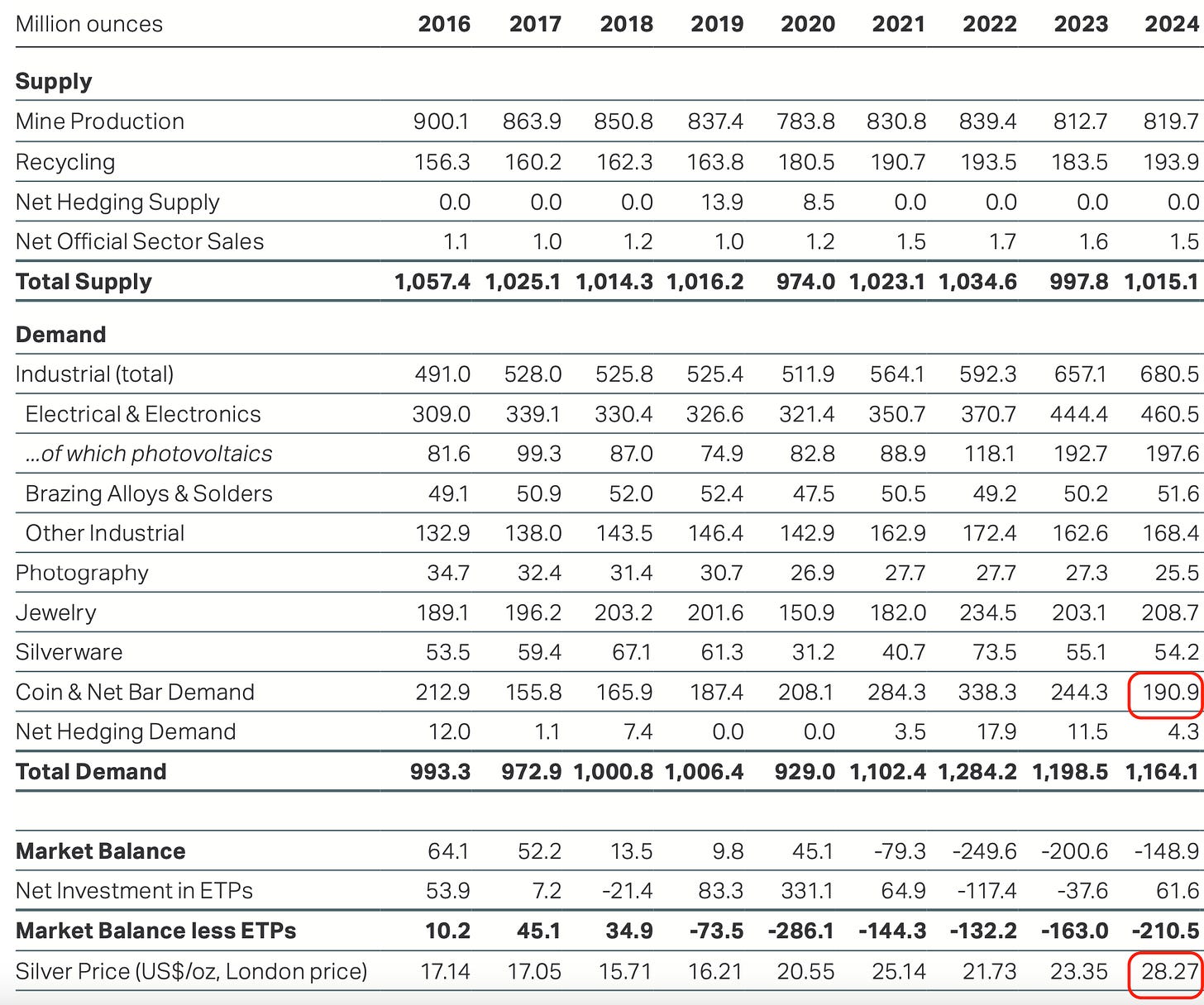 And that 209 million ounces is just a million ounces shy of the 210 million ounce deficit the Silver Institute reported in their latest World Silver Survey for 2024 if you include the metal that went into the ETFs.