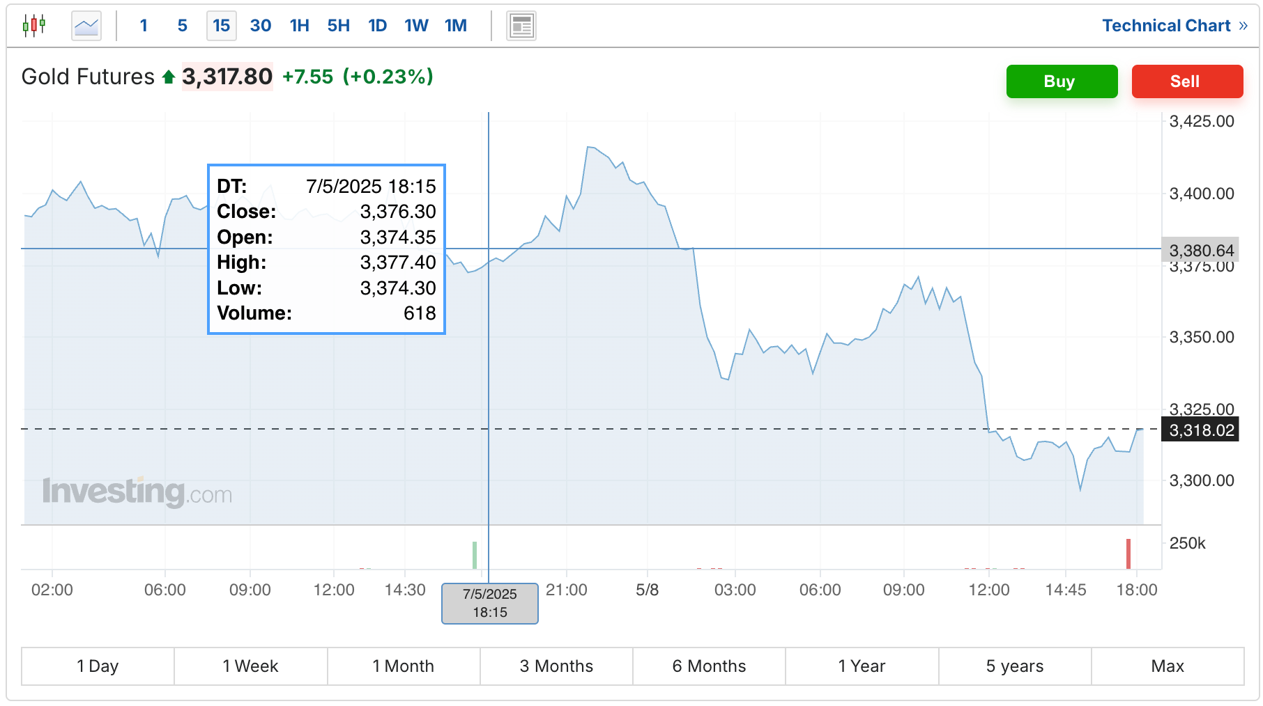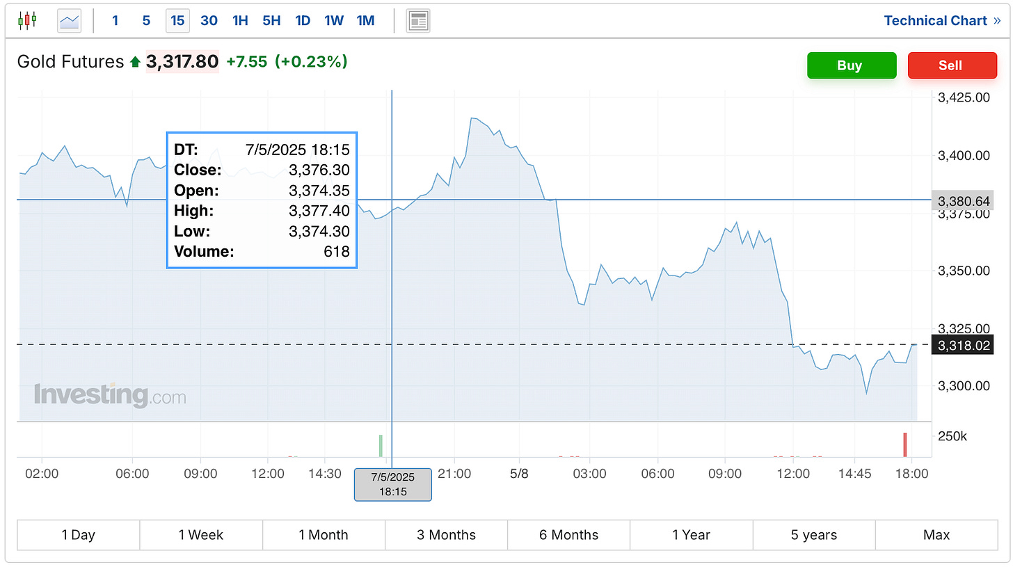 Here you can see the gold sell-off since last night, and throughout the morning and afternoon in the US.