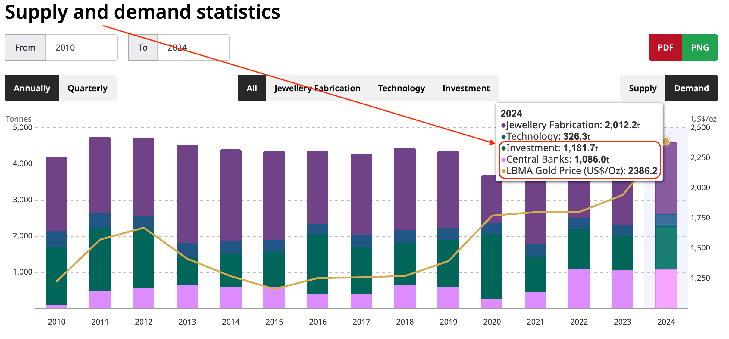 In the chart below you can see the 2024 investment demand numbers from the World Gold Council. Combining what the World Gold Council labels investment, along with Central Bank purchases, gives you a total of 2267.7 tonnes. That's 79.97 million ounces, times an average gold price of $2,386, which gives you a total of $190.8 billion.
