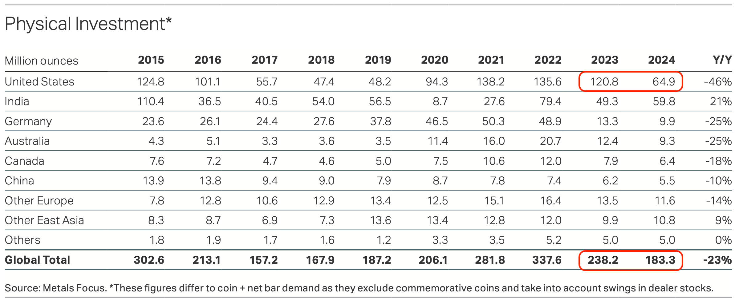 The US represented about a half of global investment demand in 2023. And thanks in large part to a wave of selling in US retail throughout 2023-2024, that number dropped to about a third last year.