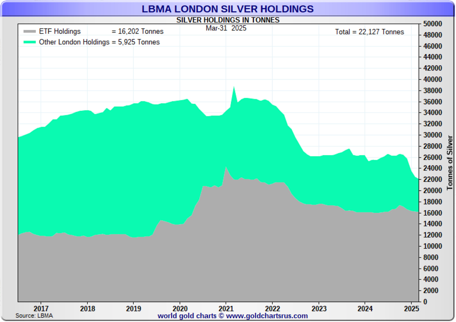 Right now the LBMA silver vaults hold 22,127 tonnes, but 16,202 of those tonnes are accounted for by the ETFs, leaving 5,925 tonnes in the ‘free float.’ That’s about 209 million ounces.