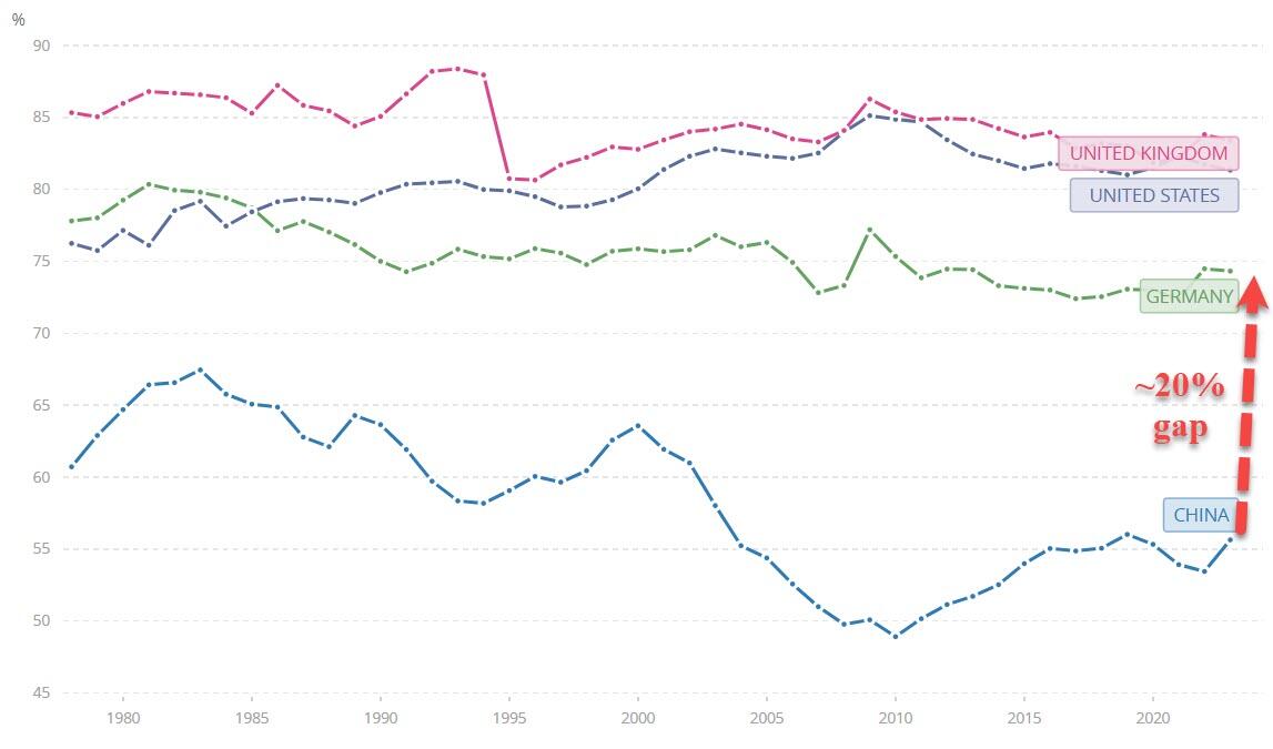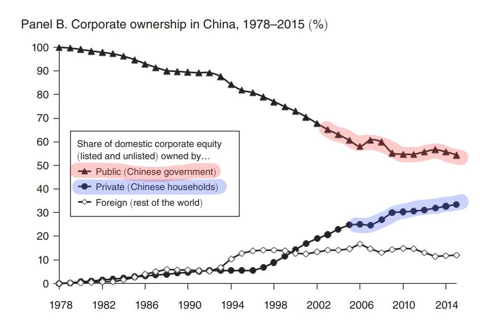 "...at the beginning of reform and opening up (December 1978), the government sector's wealth accounted for nearly 90% of society's total wealth. Although this has gradually decreased, in recent years it has stabilized at around 40%. In OECD (Western) countries, this proportion is usually lower, fluctuating around 5%...