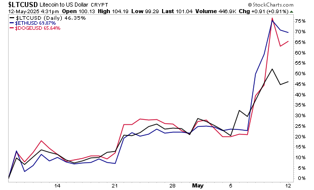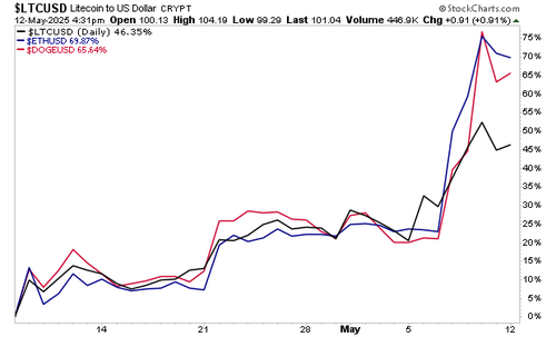 It’s not as if this is an unusual situation in the crypto space. In fact, Bitcoin’s returns since the April lows are relatively tame! Other crypto currencies are up a lot more. Litecoin is up 46%, DOGE is up 65% and Ethereum is up an incredible 70%.