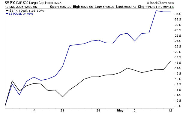 And while the S&P 500 is still well below its all-time highs, Bitcoin is already challenging its former all-time highs. Remember, this is just in the last month too!