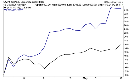 While the investing world obsesses over stocks, Bitcoin has more than doubled the performance of the S&P 500 from the April 8th lows.