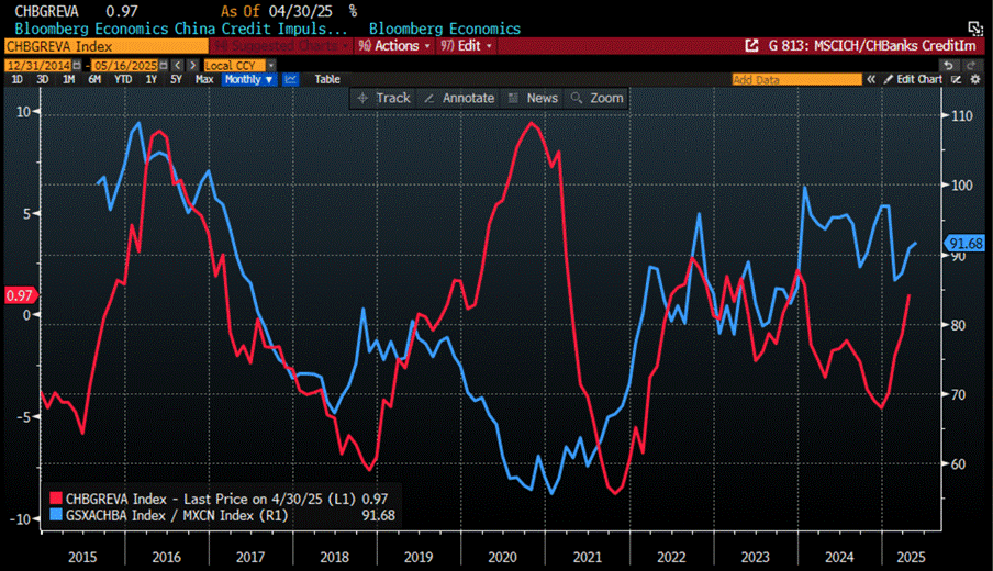 Relative performance of GS China Bank Index to MSCI China Index (blue line); China Credit Impulse 12-Month Change (red line).
