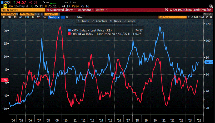 MSCI China Index (blue line); China Credit Impulse 12-Month Change (red line) & Correlation.