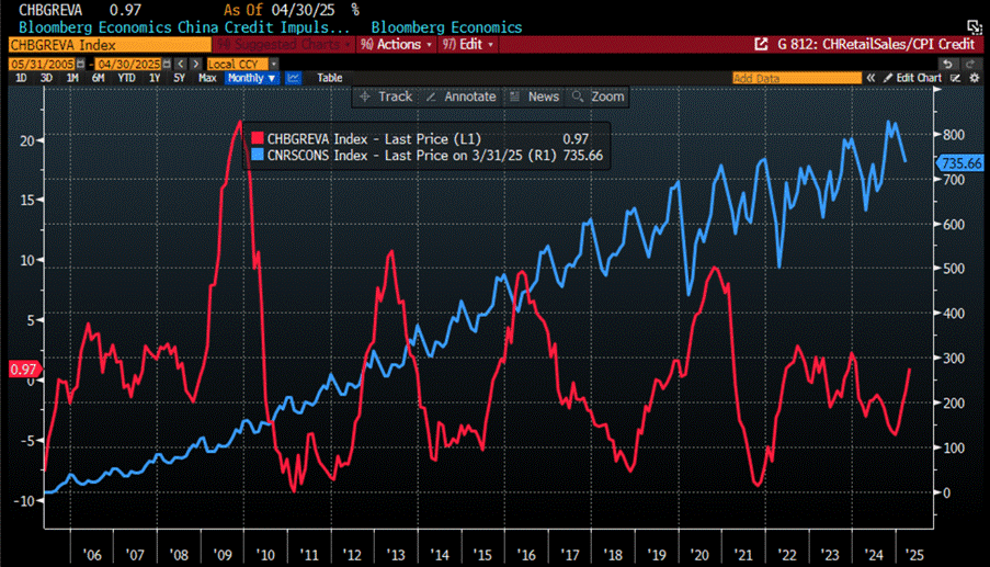 China Retail Sales Index (blue line); Bloomberg China Credit Impulse 12-Month Change (red line).