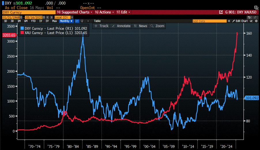 USD Index (DXY Index) (blue line); Gold Price in USD Terms (red line).