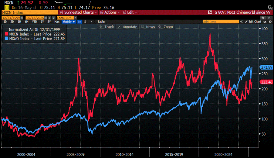 Performance of MSCI World (blue line) and MSCI China (red line) in USD since December 31st, 1999.