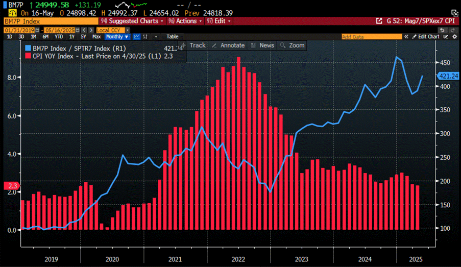 Relative Performance of Magnificent 7 to S&P 493 (blue line); US CPI YoY Change (red histogram).