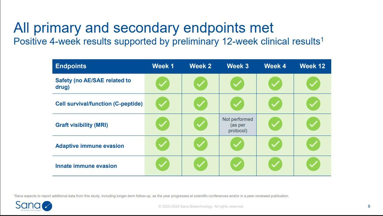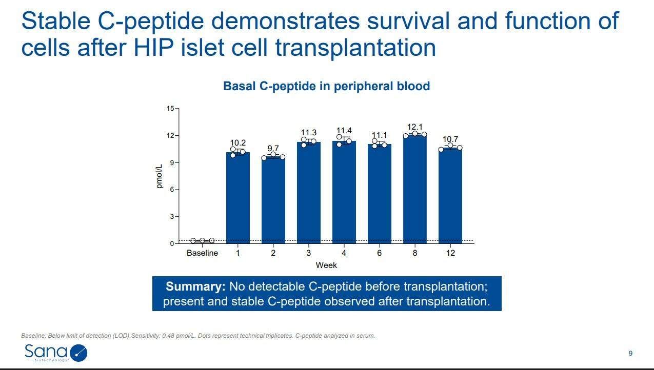 A recent presentation by Sana shows the results of this experiment so far. The C-peptide mentioned there is a biomarker of insulin production.
