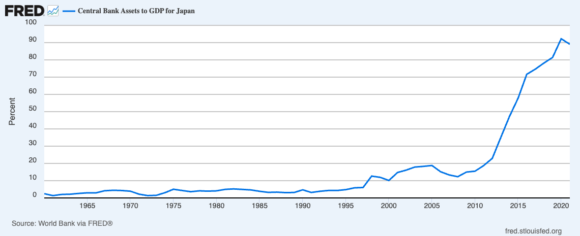 Since that time, the Bank of Japan (BoJ) has effectively nationalized the country’s financial system to the point that it (the BoJ) is now the single largest owner of Japanese stocks and Japanese bonds in the world. Things have gotten so extreme that there are times in which certain Japanese government bonds don’t even trade anymore because the BoJ owns so much of the market.