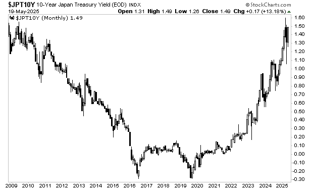 The yield on the 10-Year Japanese Government Bond has EXPLODED higher in the last couple of years. As I write this, yields are at levels last seen in 2008… when the BoJ’s balance sheet was equal to only 15% of the country’s GDP.