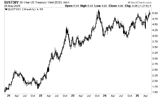Mr. Bond is telling us the bill will increase spending. The yield on the 30-Year U.S. Treasury is at 5%, which is right near the top of its range for the last five years. This is also the highest this bond’s yield has traded since President Trump took office.
