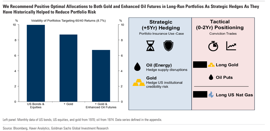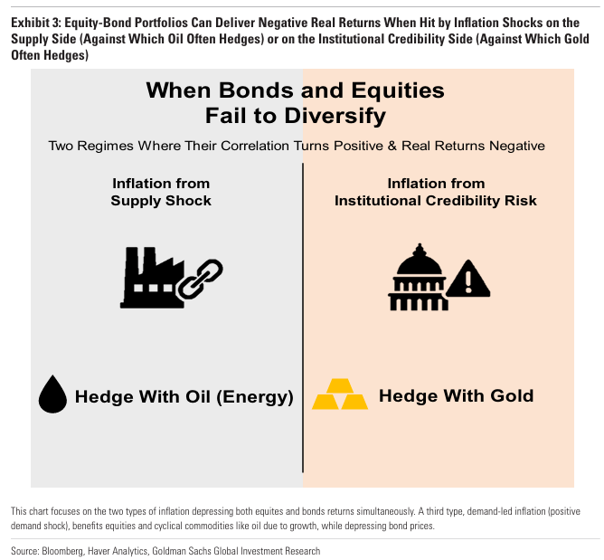 The Precious Metals and Energy analysts at Goldman Sachs Daan Struyven, Lina Thomas, Samantha Dart have overtly taken a step to recommend replacing a portion of Bonds in the previously dogmatically adhered to 60/40 stock-Bond portfolio mix. This is not a short term trade idea, nor is it one of those macro “plays” the market has seen so much of these past two years. This is a call to change how Pensions and the largest institutions allocate big money to hedge equity risk. As such, it is (to our eyes) the very first shot across the bow for global money managers to take heed on how they’ve been allocating client money on autopilot for the last 15 years.