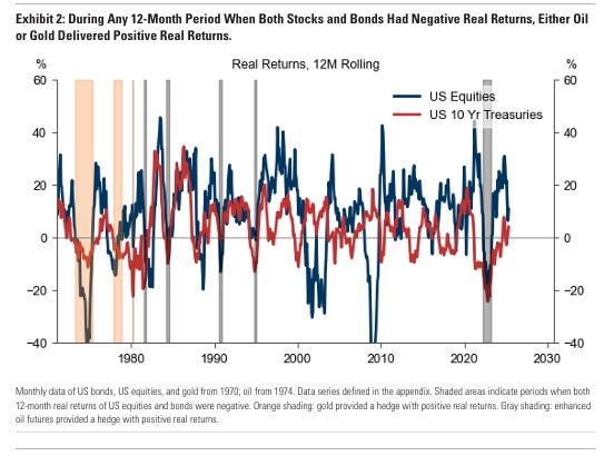 During any 12-month period where both stocks and bonds posted negative real returns, either gold or oil provided positive real returns. That’s the foundational empirical case. Portfolios need protection from dual-front inflation—and that means real assets.