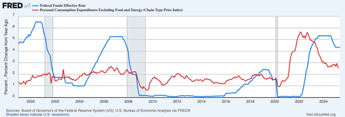 Again, the Fed has screwed up. Real rates are now positive 2% (Fed funds rate of 4.5%- Core-PCE of 2.5% = REAL rates of positive 2%). This is in fact HIGHLY restrictive. Indeed, during the last 25 years, whenever real rates have been this positive it’s only been a matter of time before something broke in the economy. See for yourself. The gray bars in the below chart market recessions.