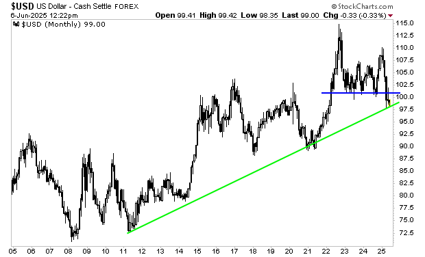 Take note, the $USD is breaking down BADLY. It’s not only taken out critical support but it’s also failed to reclaim it (blue line in the chart below). And as I write this, the $USD is just sitting on its bull market trendline from the 2011 lows. If the greenback takes out that line, BUCKLE UP because it will have systemic implications for the financial system.