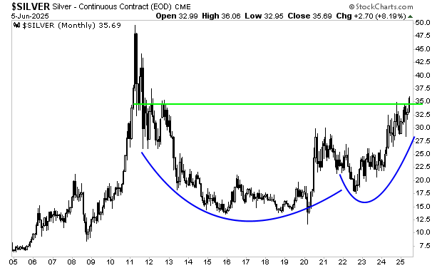 Gold, silver, platinum and other inflation hedges are already showing us as they erupt higher. Silver has a massive 15 year Cup and Handle formation in place that suggests a parabolic move is coming.